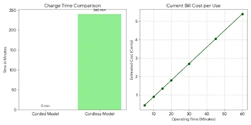 There is a bit of a misunderstanding about this machine that I need to clear up for you. People always ask about the charge time but the truth is it is not cordless. Most standard Little Green models are corded which means there is no charge time at all. You just plug it into the wall and it runs as long as you have water in the tank. As for the current bill and power consumption the motor is usually around 3 Amps. In terms of your electricity bill it is basically the same as running a high end hair dryer or a small microwave for a few minutes. Unless you are planning to clean your entire neighborhood’s sofas you will not even notice a change in your monthly current bill. It is very efficient for the spot cleaning it was designed to do.